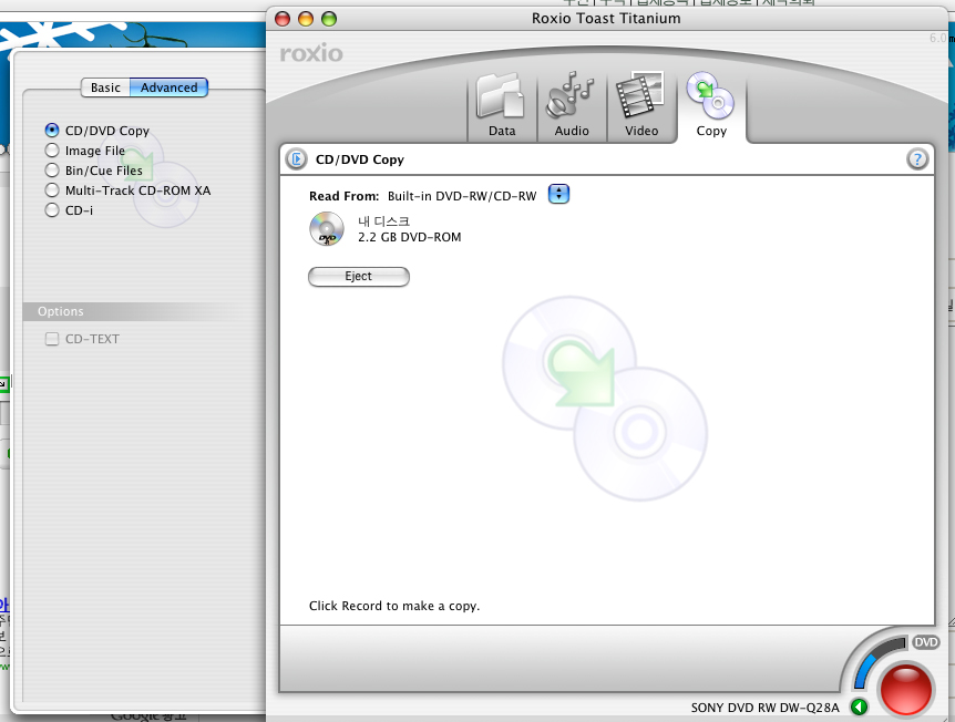 DVD Copy의 경우에는 원본 DVD를 매킨토시 본체에 넣은 후에 위의 이미지에서처럼 Read From에 해당 내용이 제대로 나타나면 바로 우측 하단의 레코드 버튼을 클릭하면 됩니다.